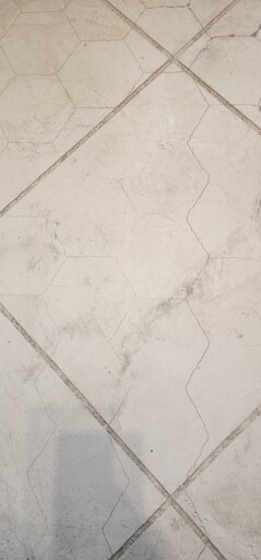 For what it’s worth, it looks more like someone tiled on top of tile for some reason? Like under the big square is the hexagonal, and the big tiles are cracking along the low spots of the tiles below.
