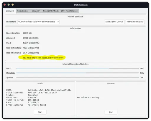 On my desktop, I have about 200GB free, which is about 10%, which feels like the bare minimum, and the only reason I haven’t upgraded yet is that there’s some large directories I can archive should it be necessary.
