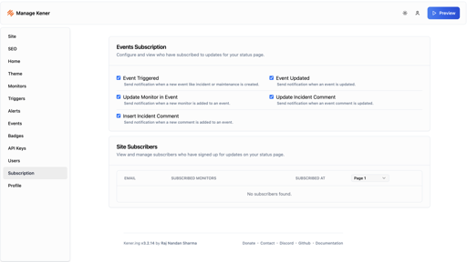 arrow-up143arrow-down1imageKener open source status page v3.2.14 released with the most requested change: Subscribe to monitorsplus-squarelemmy.worldrajnandan1@lemmy.world to Selfhosted@lemmy.worldEnglish · edit-28 months agomessage-square3fedilink